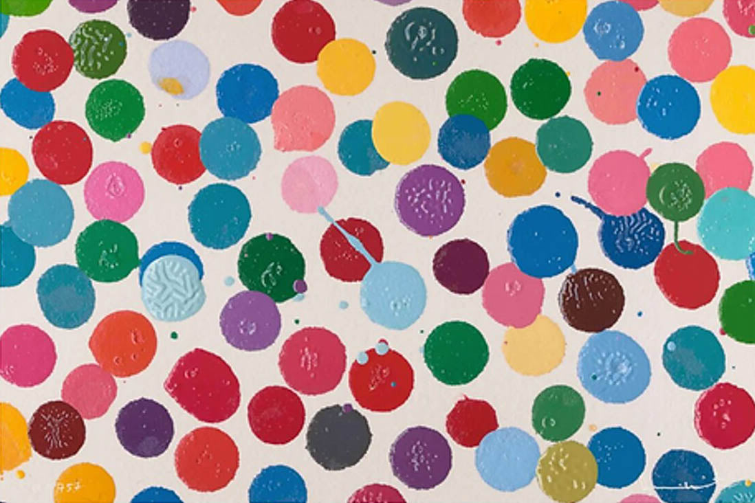 An extraordinary new perspective on Damien Hirst's The Currency collection, Unique Print (H11-757), 2022, show close-up details of the painted works. Each print is unique, hand-numbered and hand-signed on the front by Damien Hirst.