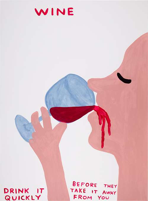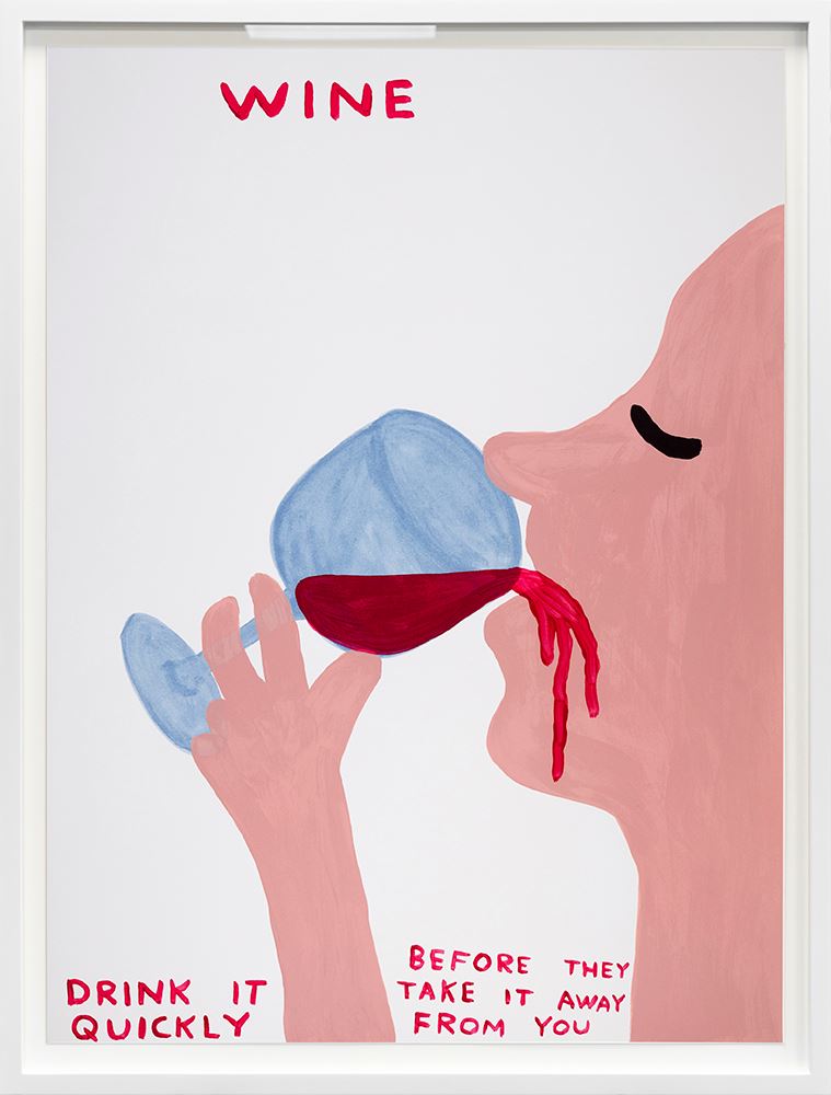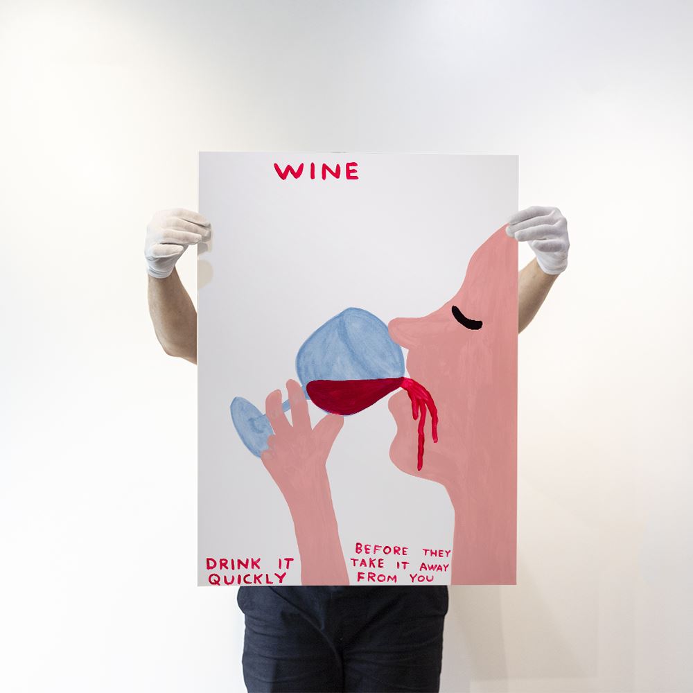 "Wine, Drink It Quickly (2021)", a limited edition screenprint signed and numbered by the highly collectable artist, David Shrigley. Known for his flat compositions accompanied by satirical comments on mundane, everyday situations, contact the team with any enquiries on the David Shrigley collection.