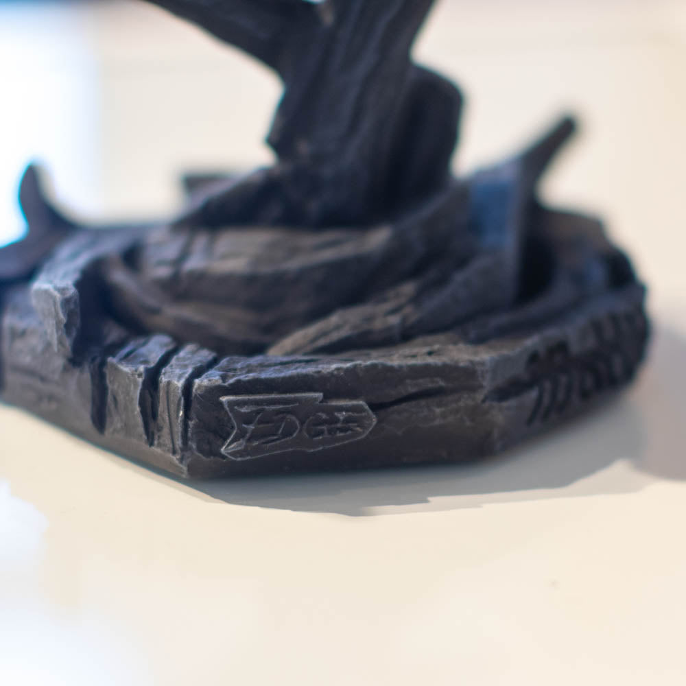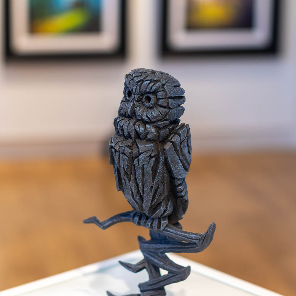 Striking owl sculpture in deep shades, showcasing layered textures, sharp features, and a steady watchful stance.