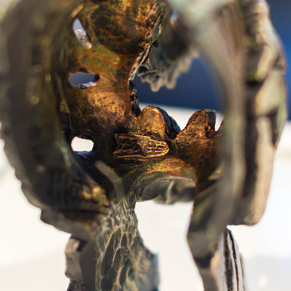 A dramatic prehistoric sculpture with pop-art flair.