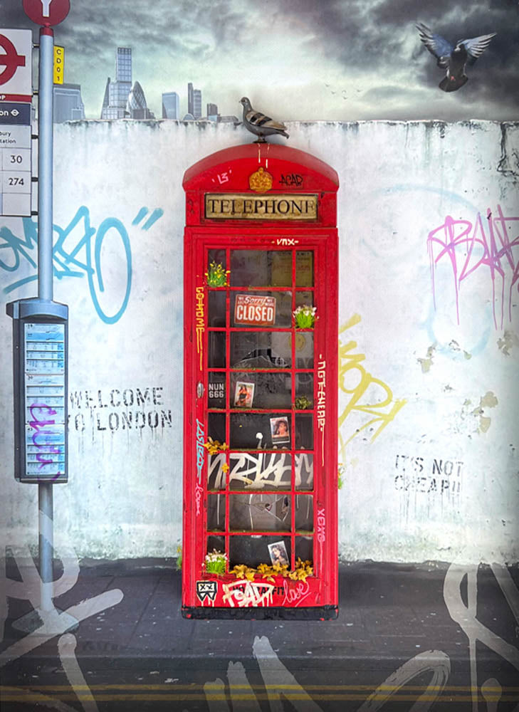 "Collect Call - Rule Briannia" by JJ Adams. A hand-painted, three dimensional London red telephone box sculpture affixed to a limited edition canvases, finished in a graffiti embellished shadow box frame. Only an edition of 10 + 3AP's!