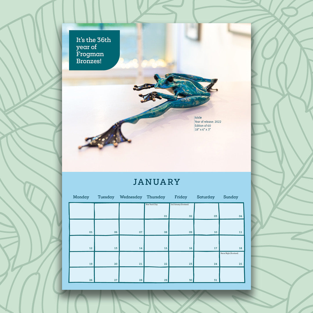 Leap into 2026 with the Frogman Calendar. A must-have for Frogman collectors and admirers.